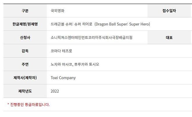 온라인등급분류서비스-등급진행자료조회 - 영화(Dragon Ball Super: Super Hero)