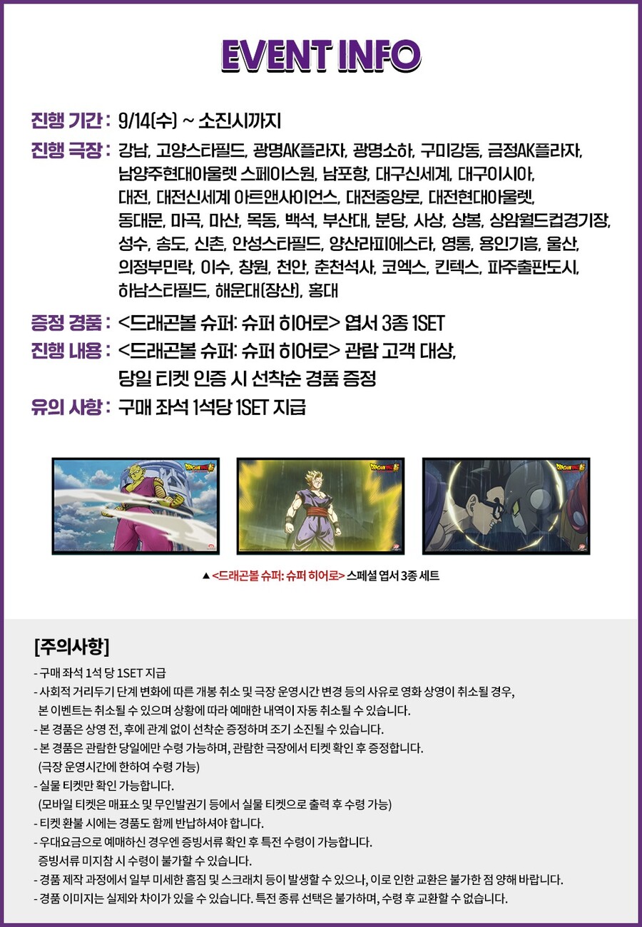 | 드래곤볼 슈퍼: 슈퍼 히어로 롯데시네마 개봉 기념 현장 경품 증정 이벤트 (1) | 2022.09.05 |