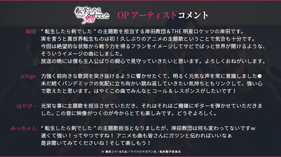 “전생하면 검이었습니다”의 주제가를 담당하는 키시다 교단 & THE 메이세이 로켓츠의 키시다입니다.