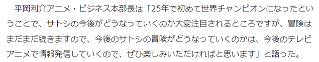 アニメ「ポケットモンスター」で主人公・サトシが世界チャンピオンに輝いた。アニメを放送しているテレビ東京の社長は1日の定例会見で、サトシを祝福。「大変嬉しいですし、我々として